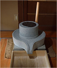 ねむりから覚ませた活きた豆を 挽きたて、打ちたて、茹でたての最高の状態で味わって頂きたいという想いから、限定20食分の玄そばを その日の早朝に製粉します。皮殻付きのまま、石臼でゆっくりと荒摺りしてパウダー状の粉にしていきます。